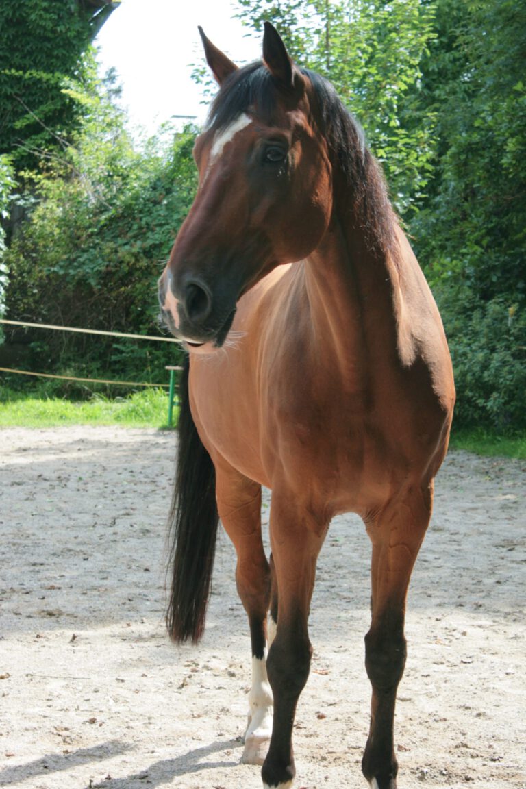 Cino ist ein ehemaliges Dressurpferd und mittlerweile zu alt für den Turniersport. Mit seinen stolzen 1,74m Stockmaß ist er kaum zu übersehen. Da er durch seine Dressurvergangenheit schon viel erlebt hat, ist der Hannoveraner-Wallach ein ruhiges, aufgeschlossenes und neugieriges Pferd. Er ist eine kleine Naschkatze und würde am liebsten den ganzen Tag nur Bananen fressen.