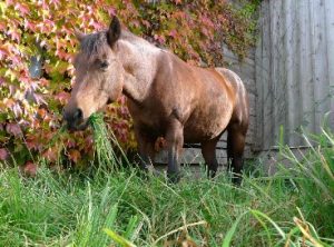 Emma, geboren im Jahr 2000, ist ein Ponymix. Durch ihre gemächliche, ruhige Art ist sie ein verläßliches Reitpferd, aber auch für vieles andere zu haben. Emma ist ungewöhnlich mutig – wenn andere Pferde vor etwas Angst haben, bleibt sie immer noch souverän und gelassen. Deshalb ist sie eine Lebensversicherung im Gelände. Vor anderen Stuten allerdings will sie ihre Ruhe haben. Emma und Hella sind die Resteverwerter unseres Stalles – wenn alle andere satt sind – wer frisst noch…?