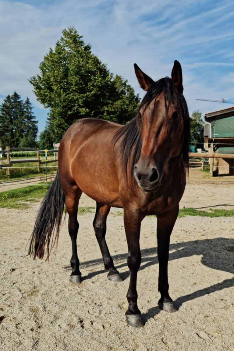 Rio ist eine Traberstute und hat eine Vergangenheit als Trabrennpferd. Sie wurde gerettet, da ihr Vorbesitzer sie aufgrund einer Verletzung nicht mehr haben wollte. Mit ihren 1,67m zählt sie zu den Größeren in der Herde. Bis jetzt wird sie erst noch vereinzelt eingesetzt, da sie noch einiges lernen muss.