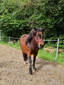Sammy ist ein Shetland-Pony. Sie kann trotz ihrer Größe von 1,07 m, mit der sie die Kleinste ist, gegenüber ihren anderen Herdenmitgliedern ganz schön frech werden. Im Umgang mit Kindern ist sie jedoch gelassen.